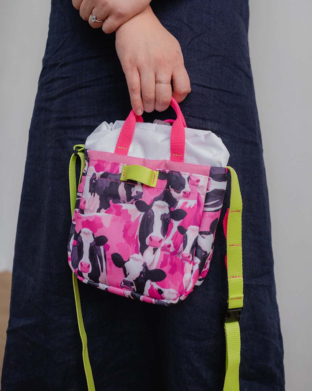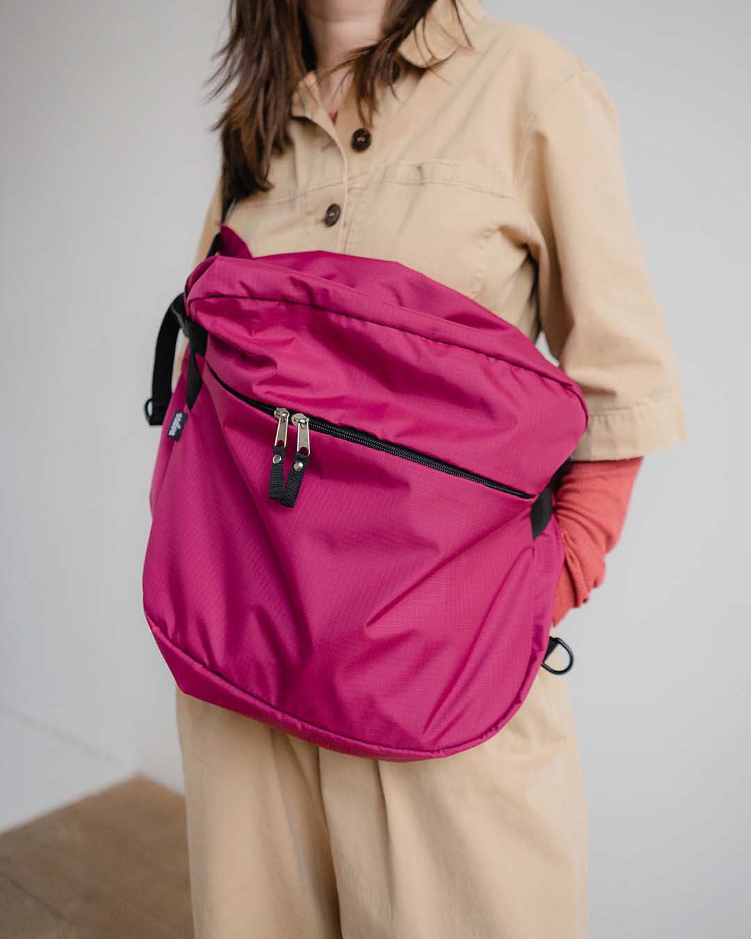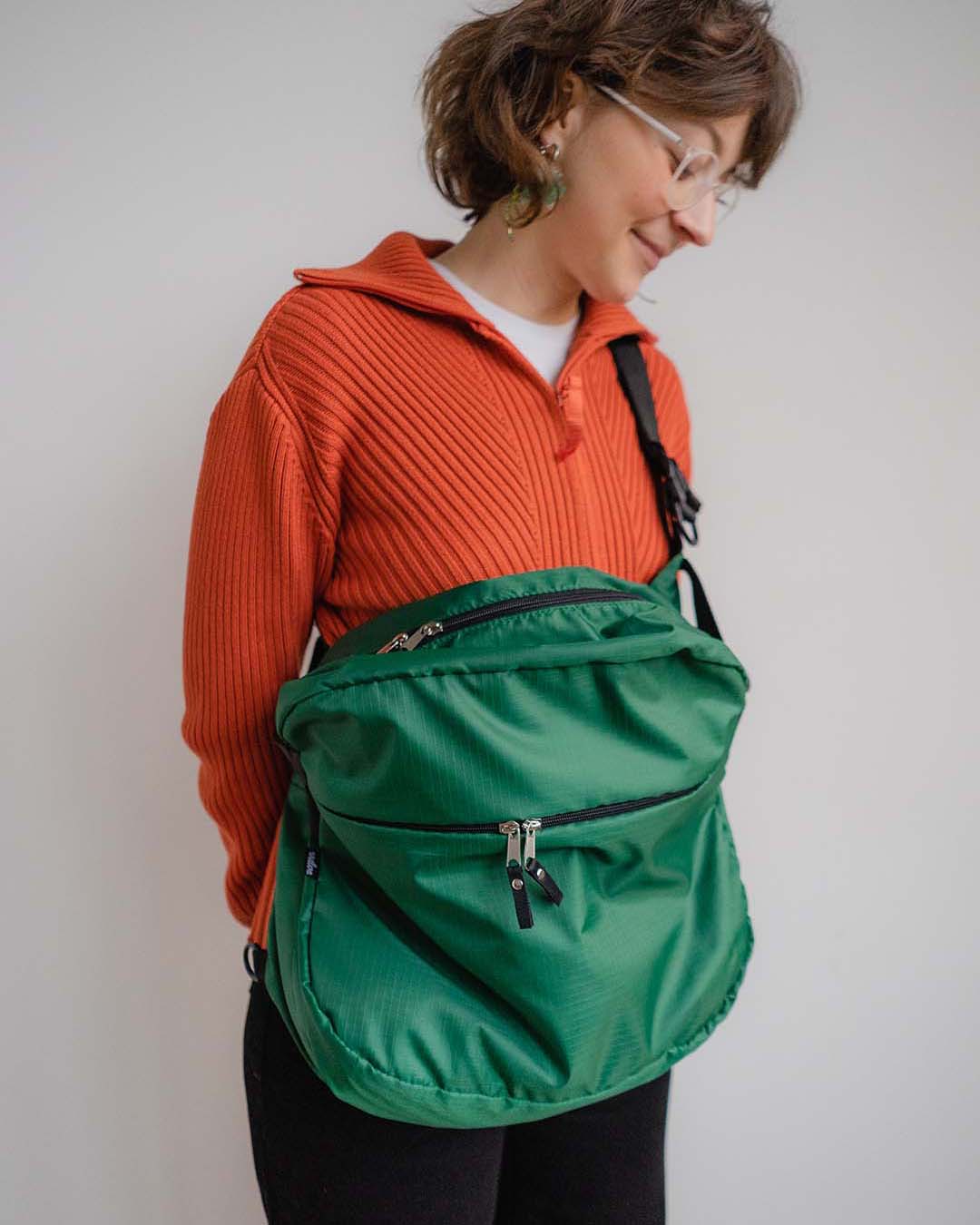 18х18х7см +5см клапан • Карман из сетки спереди, • Карман на магните сзади, • Большое основное отделение на утягивающемся клапане для быстрого доступа (подклад из основного отделения можно вывернуть, что бы вытряхивать крошки)
