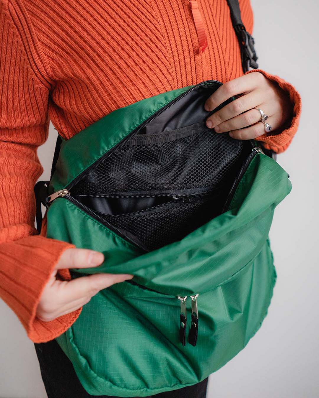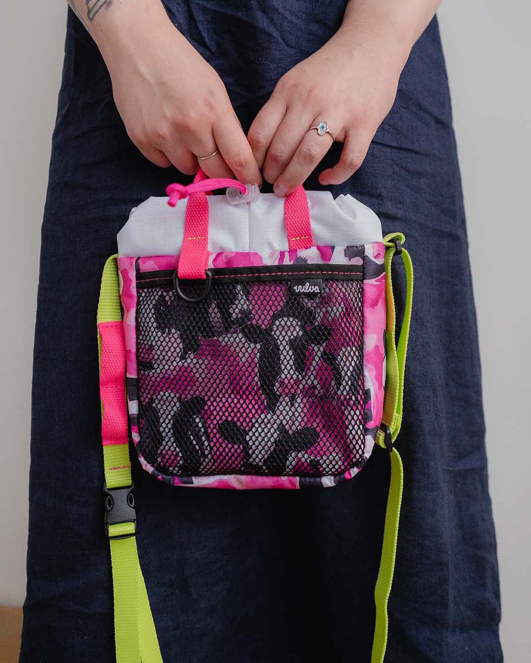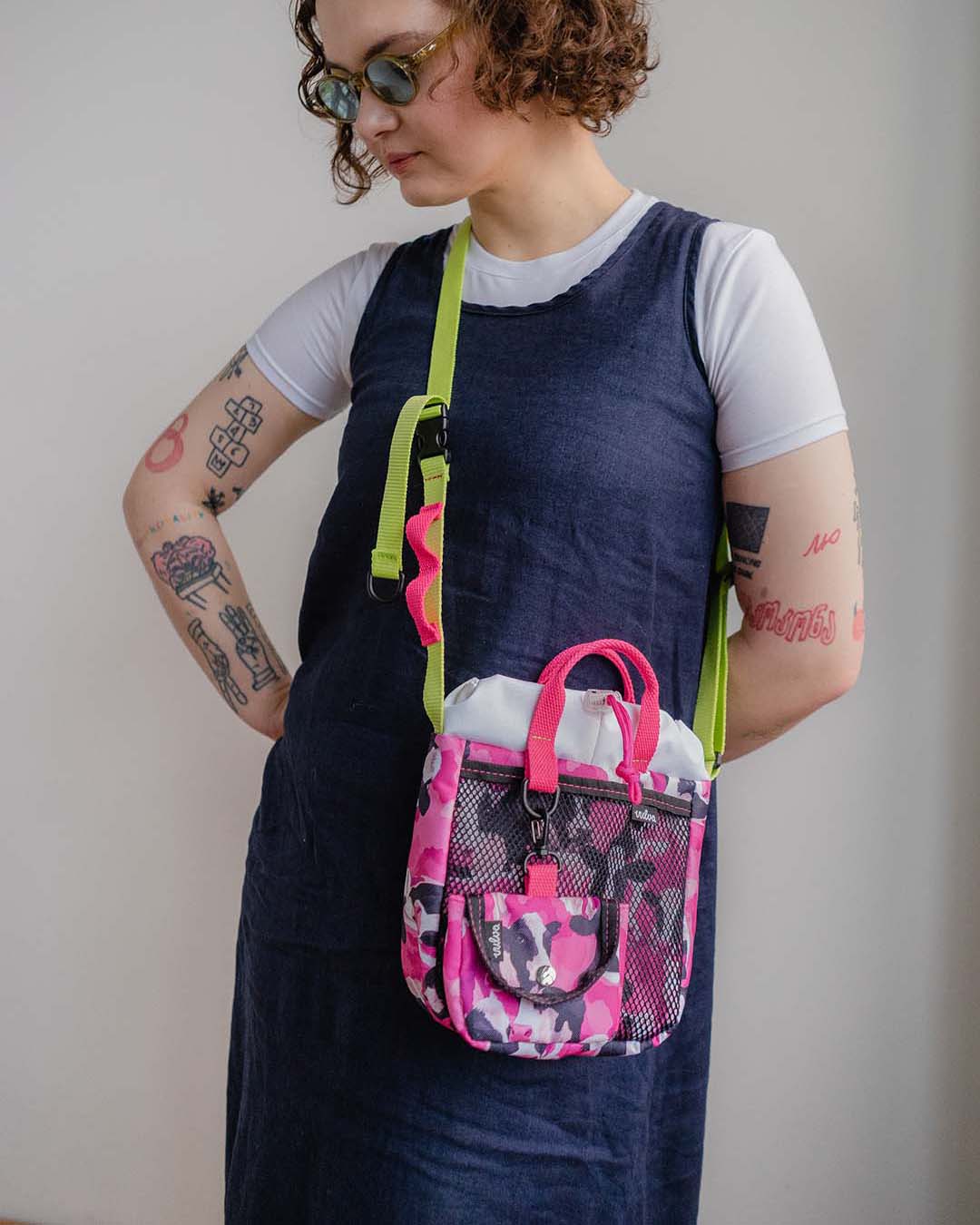 Можно носить в развернутом виде или скрутить верх и сцепить углы карабином. Основной ремешок на карабинах и регулируется по длине, можно отсоединить от сумки.